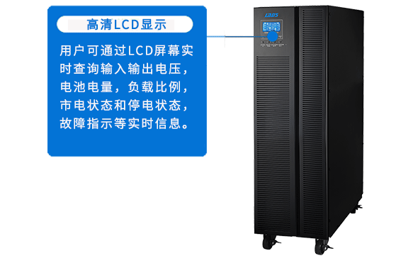 用戶可通過LCD屏幕實(shí)時查詢輸入輸出電壓,電池電量,負(fù)載比例,市電狀態(tài)和停電狀態(tài),故障指示等實(shí)時信息。